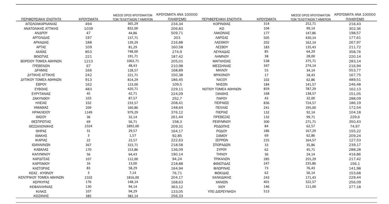 Τα νέα εργαστηριακά επιβεβαιωμένα κρούσματα της νόσου που καταγράφηκαν τις τελευταίες 24 ώρες είναι 22.694 , εκ των οποίων 37 εντοπίστηκαν κατόπιν ελέγχων στις πύλες εισόδου της χώρας. Ο συνολικός αριθμός των κρουσμάτων ανέρχεται σε 2.658.296 (ημερήσια μεταβολή +0.9%), εκ των οποίων 49.3% άνδρες. 1 Με βάση τα επιβεβαιωμένα κρούσματα των τελευταίων 7 ημερών, 219 θεωρούνται σχετιζόμενα με ταξίδι από το εξωτερικό και 1.383 είναι σχετιζόμενα με ήδη γνωστό κρούσμα.
