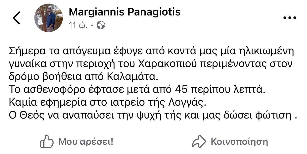 Σήμερα το απόγευμα έφυγε από κοντά μας μία ηλικιωμένη γυναίκα στην περιοχή του Χαρακοπιού περιμένοντας στον δρόμο βοήθεια από Καλαμάτα. Το ασθενοφόρο έφτασε μετά από 45 περίπου λεπτά.