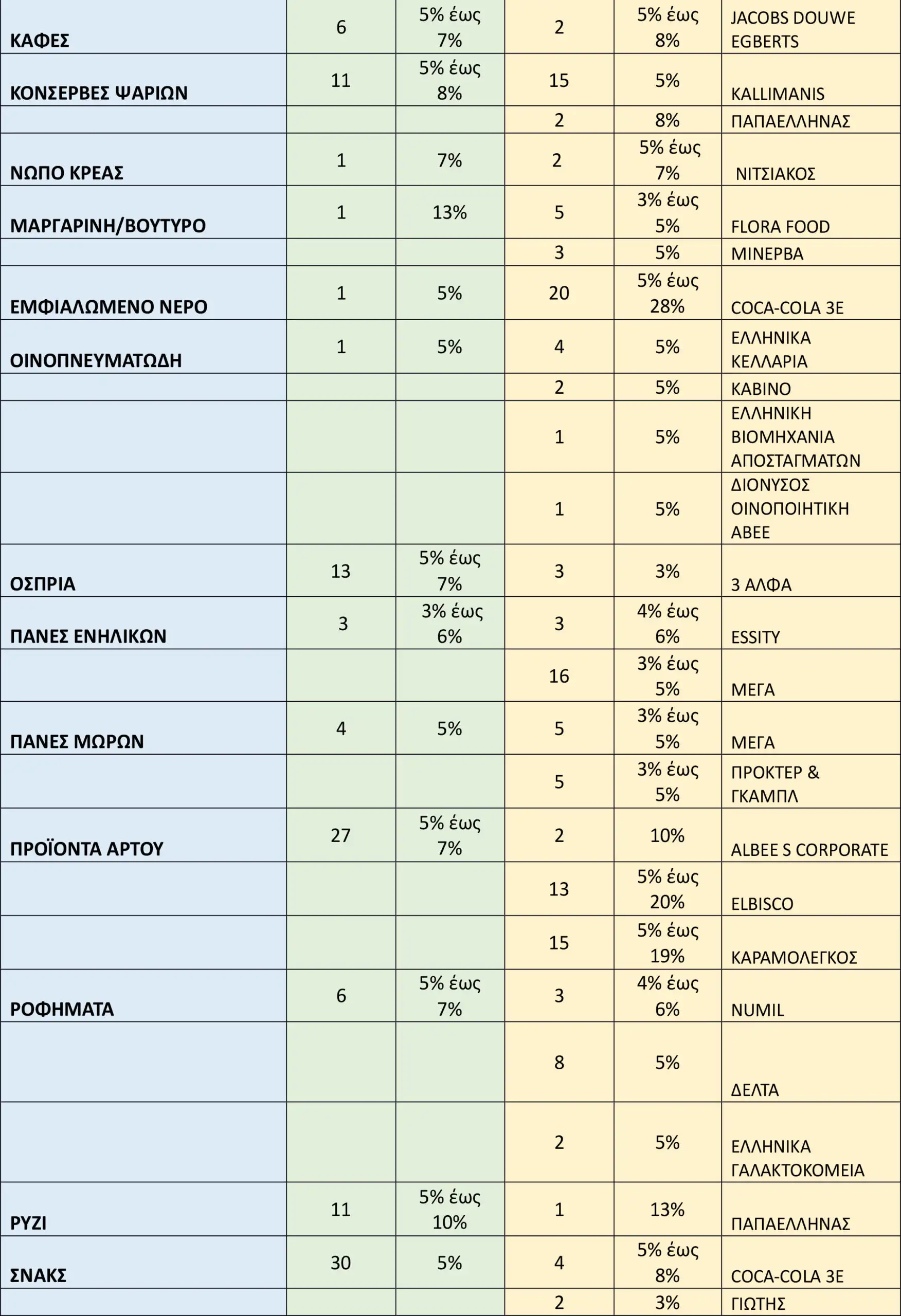 Ενδεικτικά οι μειώσεις τιμών ανά κατηγορία προϊόντων (οι οποίοι ποικίλουν ανά εταιρεία και κωδικό προϊόντος) έχουν ως εξής: