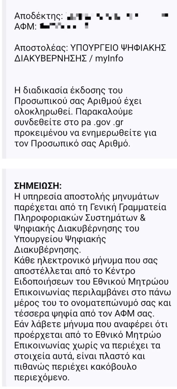 Το email που στάλθηκε αναφέρει το εξής μήνυμα: «Η διαδικασία έκδοσης του Προσωπικού σας Αριθμού έχει ολοκληρωθεί. Παρακαλούμε συνδεθείτε στο pa.gov.gr προκειμένου να ενημερωθείτε για τον Προσωπικό σας Αριθμό».