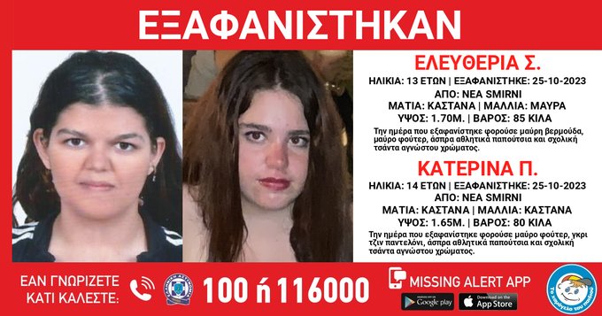 Συναγερμός έχει σημάνει από την Τετάρτη, καθώς δύο νεαρά κορίτσια εξαφανίστηκαν από την περιοχή της Νέας Σμύρνης. Πρόκειται για τις Κατερίνα Π., 14 ετών και η Ελευθερία Σ.,13 ετών, τα ίχνη των οποίων χάθηκαν από το μεσημέρι της Τετάρτης.