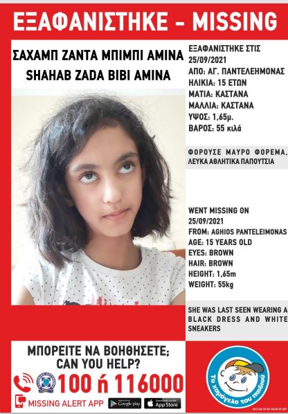 Συναγερμός σήμανε στις Αρχές για την εξαφάνιση της Σαχαμπ Ζαντά Μπίμπι Αμινά, η οποία εξαφανίστηκε στην περιοχή του Αγίου Παντελεήμονα στις 25 Σεπτεμβρίου. Η 15χρονη, σύμφωνα με την ανακοίνωση του Χαμόγελου του Παιδιού έχει ύψος 1,65 μ. και βάρος 55 κιλά και την ημέρα της εξαφάνισής της φορούσε μαύρο φόρεμα και λευκά αθλητικά παπούτσια.
