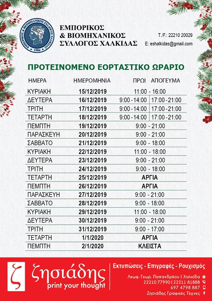 Το εορταστικό ωράριο των καταστημάτων της Χαλκίδας