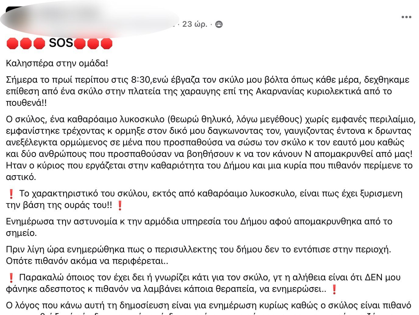 Η ίδια αναφέρει συγκεκριμένα: «Σήμερα το πρωί περίπου στις 8:30, ενώ έβγαζα τον σκύλο μου βόλτα όπως κάθε μέρα, δεχθήκαμε επίθεση από ένα σκύλο στην πλατεία της Χαραυγής επί της Ακαρνανίας κυριολεκτικά από το πουθενά!! Ο σκύλος, ένα καθαρόαιμο λυκόσκυλο (θεωρώ θηλυκό, λόγω μεγέθους) χωρίς εμφανές περιλαίμιο εμφανίστηκε τρέχοντας και όρμησε στον δικό μου δαγκώνοντας τον, γαυγίζοντας έντονα και δρώντας ανεξέλεγκτα ορμώμενος σε μένα που προσπαθούσα να σώσω τον σκύλο και τον εαυτό μου καθώς και δύο ανθρώπους που προσπαθούσαν να βοηθήσουν και να τον κάνουν να απομακρυνθεί από μας. Ήταν ο κύριος που εργάζεται στην καθαριότητα του Δήμου και μια κυρία που πιθανόν περίμενε αστικό. Το χαρακτηριστικό του σκύλου, εκτός από καθαρόαιμο λυκόσκυλο, είναι πως έχει ξυρισμένη την βάση της ουράς του!!! Ενημέρωσα την αστυνομία κ την αρμόδια υπηρεσία του Δήμου αφού απομακρύνθηκα από το σημείο. Πριν λίγη ώρα ενημερώθηκα πως ο περισυλλεκτης του δήμου δεν το εντόπισε στην περιοχή. Οπότε πιθανόν ακόμα να περιφέρεται.. ! Παρακαλώ όποιος τον έχει δει ή γνωρίζει κάτι για τον σκύλο, γιατί η αλήθεια είναι ότι ΔΕΝ μου φάνηκε αδέσποτος και πιθανόν να λαμβάνει κάποια θεραπεία, να ενημερώσει..! Ο λόγος που κάνω αυτή τη δημοσίευση είναι για ενημέρωση κυρίως καθώς ο σκύλος είναι πιθανό να επιτεθεί ξανά εάν δεν πιαστεί με κίνδυνο να έχουμε χειρότερους τραυματισμούς σε ζώα και ανθρώπους απ ότι είχαμε εμείς σήμερα… Επίσης, μπορεί να τον ψάχνει ο άνθρωπος του!! Και να ευχαριστήσω τους ανθρώπους που βοήθησαν, ειδικά την κυρία, μιας και εκείνη την στιγμή γίνανε όλα τόσο γρήγορα… Αν το δείτε επικοινωνήστε μαζί μου! Οποιαδήποτε πληροφορία είναι σημαντική!».