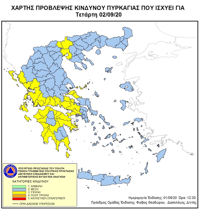 Σύμφωνα με το Χάρτη Πρόβλεψης Κινδύνου, που εκδίδει η Γενική Γραμματεία Πολιτικής Προστασίας ( www.civilprotection.gr), για σήμερα Τετάρτη 2 Σεπτεμβρίου 2020, προβλέπεται υψηλός κίνδυνος πυρκαγιάς (κατηγορία κινδύνου 3) για τη Εύβοια. Σε περίπτωση που αντιληφθούν πυρκαγιά, οι πολίτες παρακαλούνται να ειδοποιήσουν αμέσως την Πυροσβεστική Υπηρεσία στον αριθμό κλήσης 199.