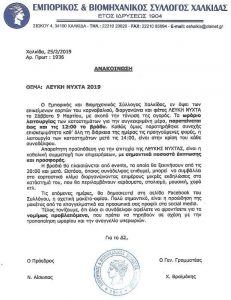 Ο Εμπορικός Σύλλογος Χαλκίδας διοργανώνει ΛΕΥΚΗ ΝΥΧΤΑ το Σάββατο 9 Μαρτίου έτσι ώστε να συμβάλλει στην τόνωση της αγοράς.