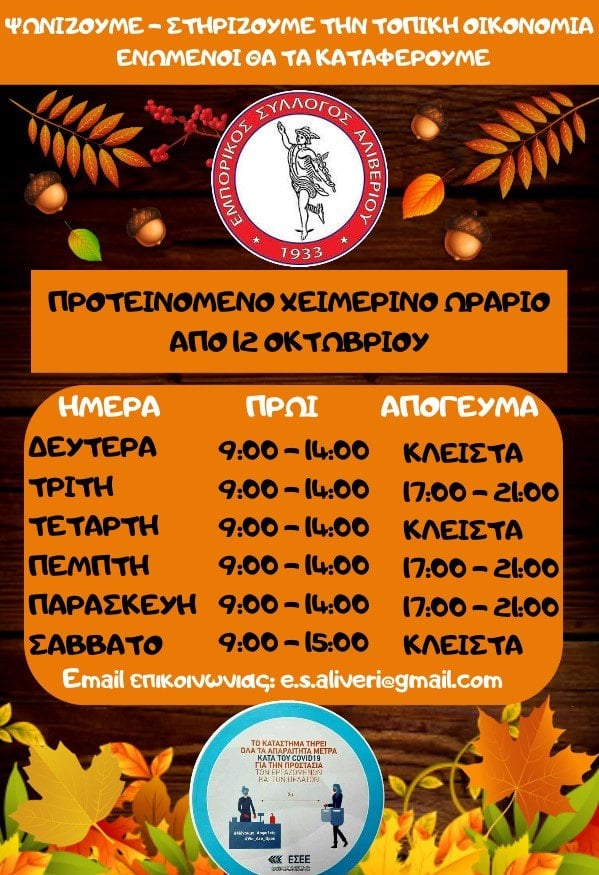 Με ανακοίνωση που εξέδωσε ο Εμπορικός Σύλλογος Αλιβερίου γνωστοποιεί το προτεινόμενο χειμερινό ωράριο των καταστημάτων της περιοχής του Αλιβερίου.