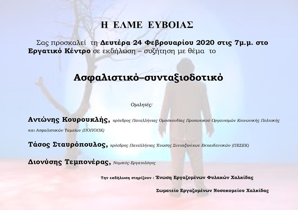 Εκδήλωση για το ασφαλιστικό-συνταξιοδοτικό διοργανώνει η ΕΛΜΕ Εύβοιας την Δευτέρα 24 Φεβρουαρίου στις 7 το απόγευμα στο Εργατικό Κέντρο Εύβοιας.