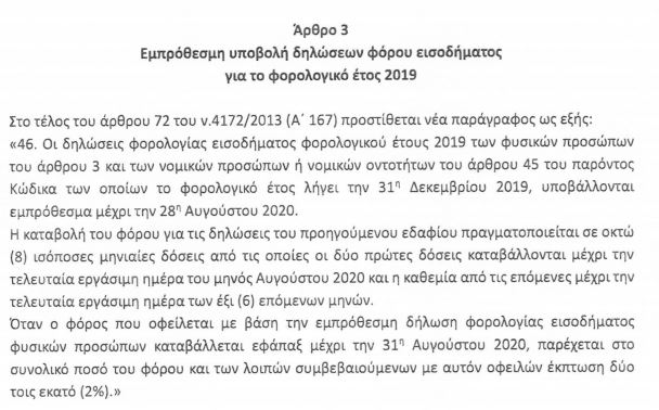 Όταν ο φόρος που οφείλεται με βάση την εμπρόθεσμη δήλωση φορολογίας εισοδήματος φυσικών προσώπων καταβάλλεται εφάπαξ μέχρι την 31η Αυγούστου 2020, παρέχεται στο συνολικό ποσό του φόρου και των λοιπών συμβεβαιούμενων με αυτόν οφειλών έκπτωση δύο τοις εκατό (2%).»