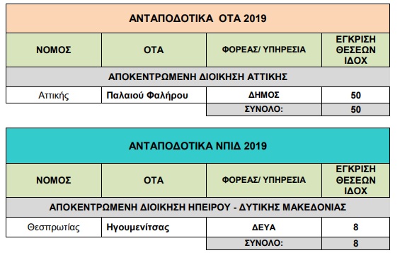 Με απόφαση του Υπουργού Εσωτερικών, Παναγιώτη Θεοδωρικάκου, εγκρίνεται η σύναψη πενήντα οκτώ (58) συμβάσεων προσωπικού με σχέση εργασίας ιδιωτικού δικαίου ορισμένου χρόνου για υπηρεσίες ανταποδοτικού χαρακτήρα στους ΟΤΑ α’ βαθμού και στα ΝΠΙΔ αυτών.