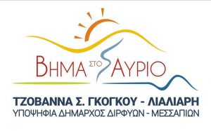 Βήμα στο Αύριο λέγεται ο συνδυασμός της υποψήφιας δημάρχου Διρφύων Μεσσαπίων Τζοβάννας Γκόγκου όπως η ίδια αποκάλυψε μέσω της σελίδας της στο facebook. Οι πρώτες αντιδράσεις είναι μόνο θετικές και ενθαρρυντικές για την υποψήφια δήμαρχο