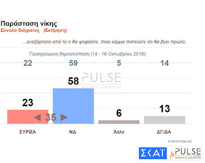 Το σταθερό «τετραπλό» προβάδισμα της Νέας Δημοκρατίας έναντι του ΣΥΡΙΖΑ επιβεβαιώνει η νέα δημοσκόπηση της Pulse για την τηλεόραση του Σκάι.