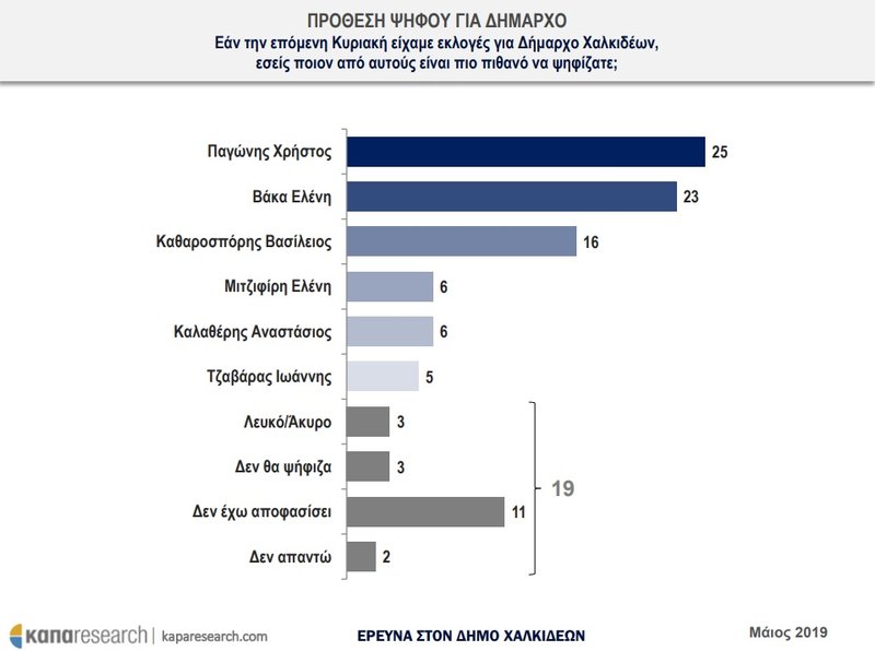 Η δημοσκόπηση της Kapa Research, διενεργήθηκε το διάστημα 13-15 Μαΐου 2019 σε δείγμα 783 δημοτών Χαλκιδέων, που ερωτήθηκαν μέσω τηλεφώνου.