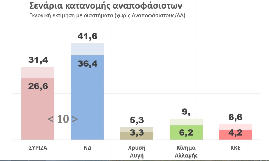 Σύμφωνα με τη δημοσκόπηση, με αναγωγή επί των εγκύρων, χωρίς τους αναποφάσιστους η ΝΔ αναμένεται να κινηθεί μεταξύ του 36,4 και του 41,6%, ενώ ο ΣΥΡΙΖΑ μεταξύ του 26,6 και του 31,4%, με τη διαφορά μεταξύ τους να φθάνει τις 10 ποσοστιαίες μονάδες.