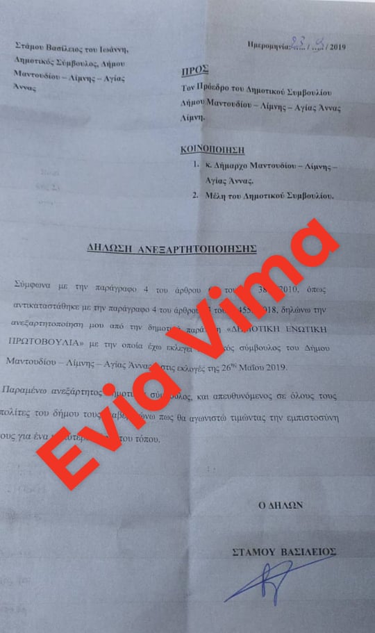 EVIMA.GR / ΠΟΛΙΤΙΚΗ / Επιβεβαίωση του eviavima-Ανεξαρτητοποιήθηκε ο Βασίλης Στάμου-Διαβάστε την επιστολή