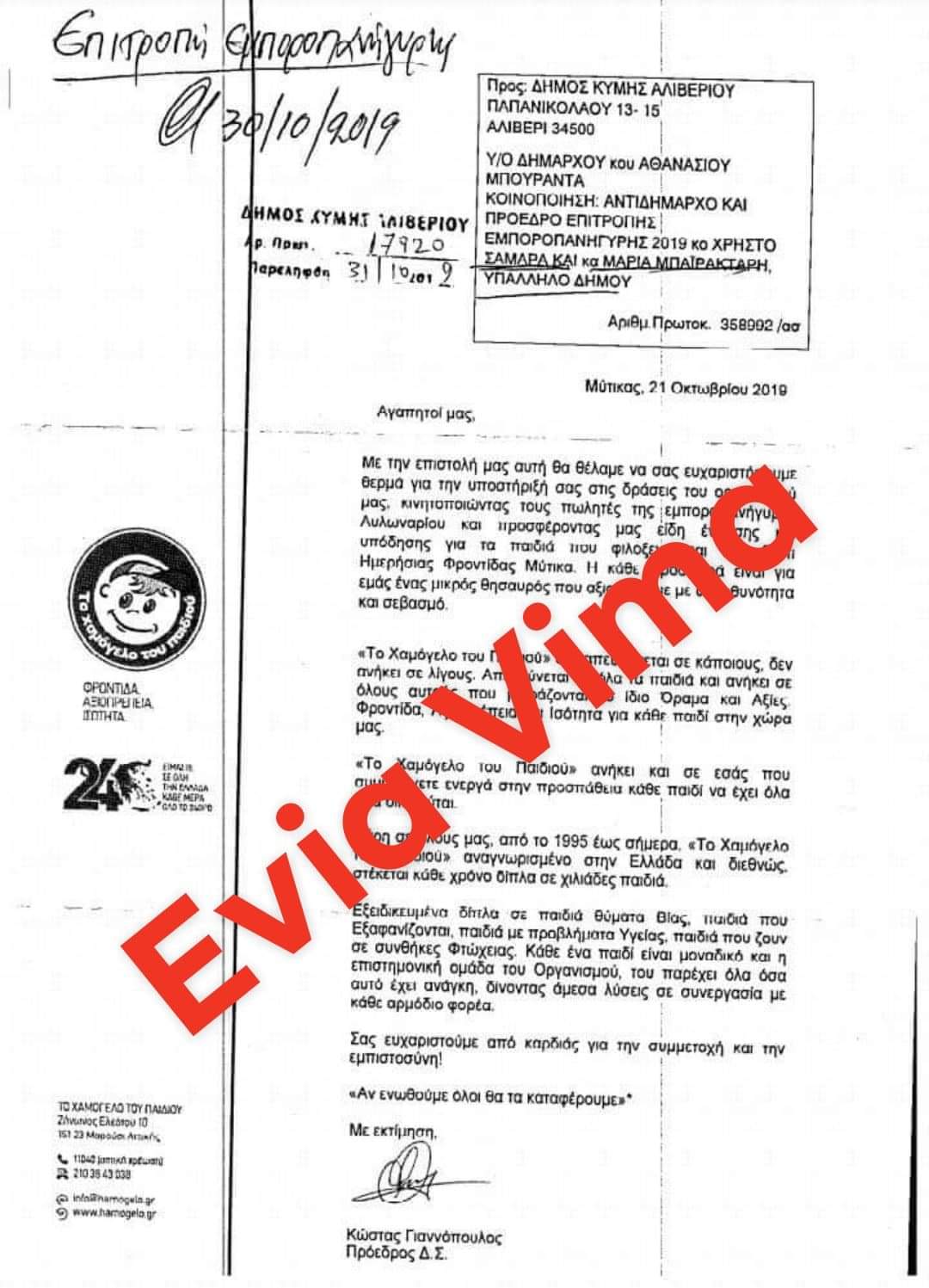 Ευχαριστήρια επιστολή του Χαμόγελου του Παιδιού στον Δήμο Κύμης Αλιβερίου[Επιστολή]