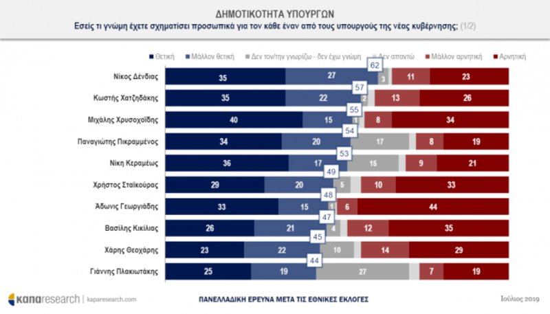 Αναφορικά με την αποδοχή των υπουργών της κυβέρνησης Μητσοτάκης, στην πρώτη θέση βρίσκεται ο υπουργός Εξωτερικών Νίκος Δένδιας με 62%, και ακολουθούν ο υπουργός Περιβάλλοντος Κωστής Χατζηδάκης με 57%, ο υπουργός Προστασίας του Πολίτη Μιχάλης Χρυσοχοϊδης 55%, ο αντιπρόεδρος της κυβέρνησης Παναγιώτης Πικραμμένος με 54 % και η υπουργός Παιδείας Νίκη Κεραμέως με 53%.