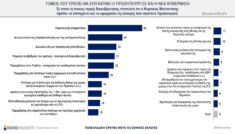 Οπως αναφέρει η δημοσκόπηση της Κάπα Research, οι ερωτηθέντες επιθυμούν πολιτική σταθερότητα, με εξάντληση της τετραετίας για τη νέα κυβέρνηση, και τήρηση των υποσχόμενων για μείωση φορολογίας και δημόσια τάξη.