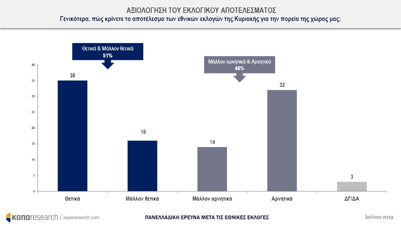 Σύμφωνα με τη μετεκλογική δημοσκόπηση της Κάπα Research, το 51% των ερωτηθέντων κρίνει θετικά ή μάλλον θετικά τα εκλογικά αποτελέσματα, ενώ το 46% την κρίνει αρνητικά και μάλλον αρνητικά. Η κυβέρνηση Μητσοτάκη, πάντως, προκαλεί θετικά συναισθήματα στους πολίτες σε ποσοστό 47% έναντι 45% που τους προκαλεί αρνητικά.