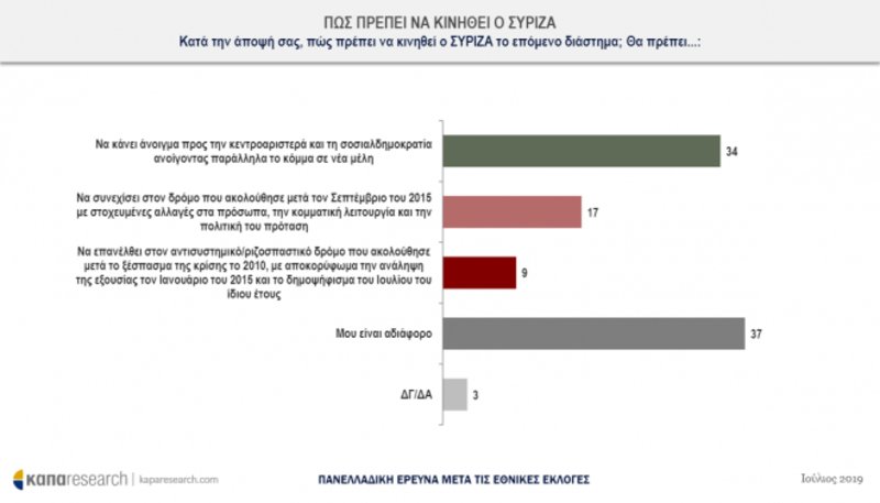Ως θετικό αξιολογεί το 63% των ερωτηθέντων το αποτέλεσμα των εκλογών για τον ΣΥΡΙΖΑ, ενώ το 62% αναφέρει ότι δεν ήταν στρατηγική ήττα για τον ΣΥΡΙΖΑ. Σχετικά με την επόμενη ημέρα του κόμματος, οι περισσότεροι από τους ερωτηθέντες εκτιμούν ότι πρέπει να στραφεί στο χώρο της Κεντροαριστεράς και της Σοσιαλδημοκρατίας.