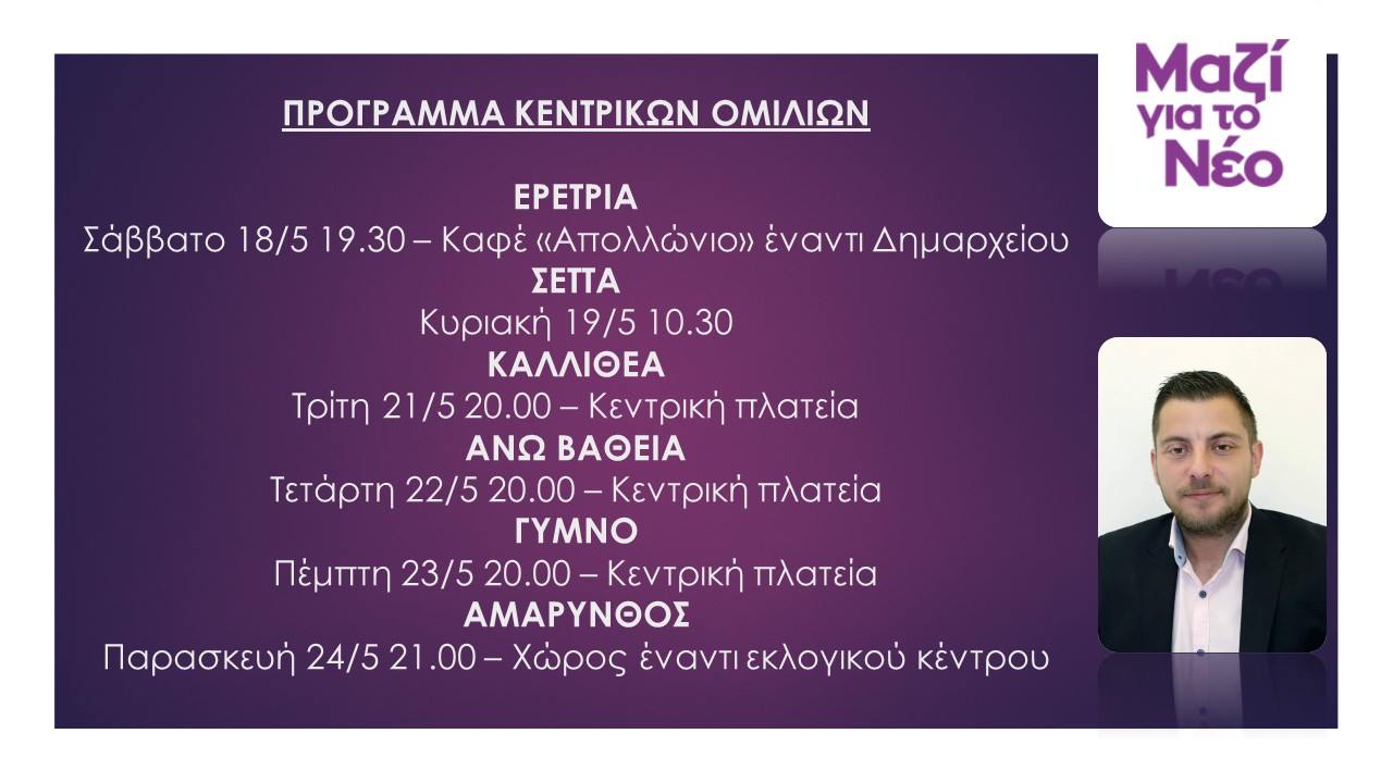 Αυτό είναι το πρόγραμμα των κεντρικών ομιλιών του Υποψήφιου Δημάρχου και επικεφαλής της κίνησής μας, Μπάμπη Καραβά. Σάββατο 18/5 19.30 Ερέτρια – Καφέ “Απολλώνιο” έναντι Δημαρχείου Κυριακή 19/5 10.30 Σέττα Τρίτη 21/5 20.00 Καλλιθέα – Κεντρική πλατεία Τετάρτη 22/5 20.00 Άνω Βάθεια – Κεντρική πλατεία Πέμπτη 23/5 20.00 Γυμνό – Κεντρική πλατεία Παρασκευή 24/5 21.00 […]