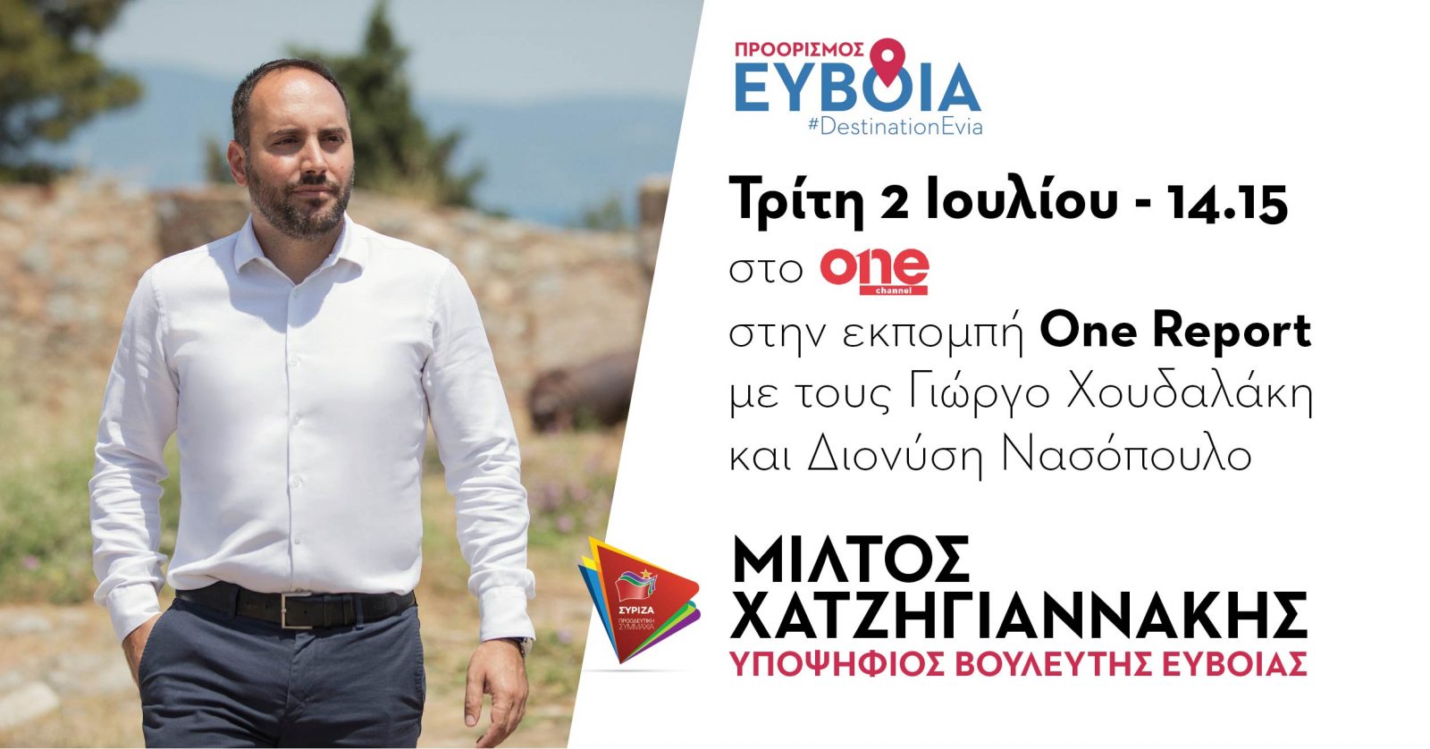 Σήμερα Τρίτη 2 Ιουλίου στις 14:15 το μεσημέρι ο υποψήφιος βουλευτής του ΣΥΡΙΖΑ για την Εύβοια Μίλτος Χατζηγιαννάκης θα φιλοξενηθεί από την εκπομπή One Report στο One Channel για μια ενδιαφέρουσα συζήτηση με τον Γιώργο Χουδαλάκη και τον Διονύση Νασόπουλο.