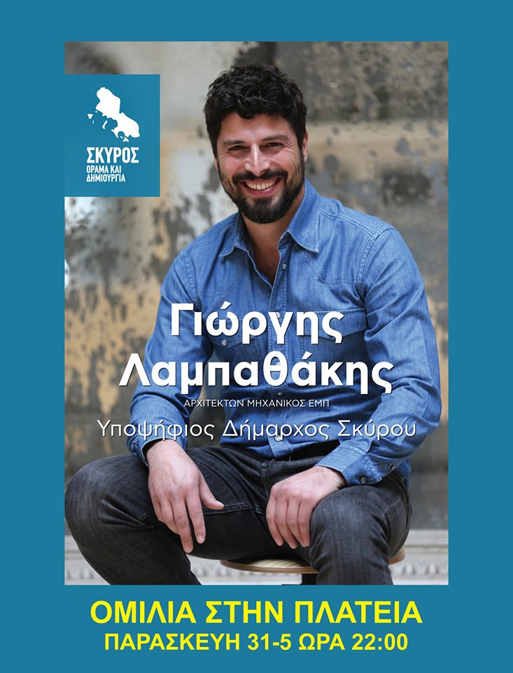 Την Παρασκευή, 31 Μαΐου, στις 22:00 ο Γιώργης Λαμπαθάκης θα αναπτύξει το Όραμα του συνδυασμού του για τις προοπτικές της Σκύρου θέτοντας στους Σκυριανούς και τις Σκυριανές το δίλημμα και την ευθύνη για την επιλογή του ικανότερου να την οδηγήσει στη Δημιουργία και τη διασφάλιση συνθηκών και προϋποθέσεων που θα διασφαλίζουν τις προοπτικές αυτές, με όχημα και σημαία τη συμμετοχικότητα και την αξιοκρατία!