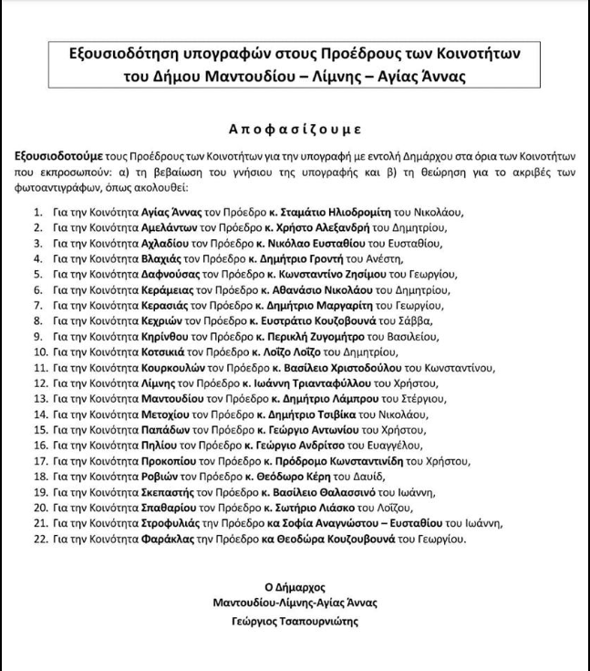 Ο δήμαρχος του δήμου Μαντουδίου, Λίμνης , Αγίας Άννας, Γιώργος Τσαπουρνιώτης ανακοίνωσε τους προέδρους των κοινοτήτων του δήμου, οι οποίοι εξουσιοδοτούνται για την υπογραφή με εντολή του δημάρχου ως εξής:
