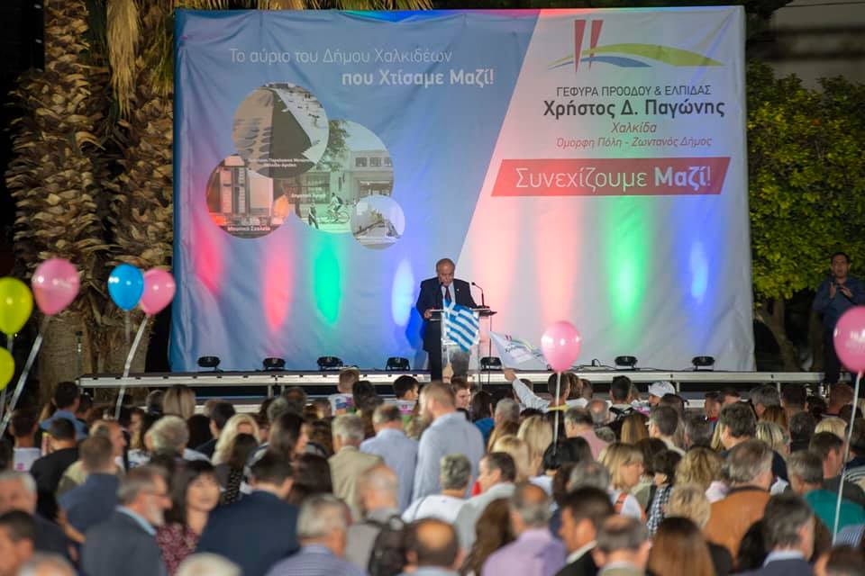 Σε μια πρωτοφανή από πλευράς κόσμου και παλμού συγκέντρωση, ο Δήμαρχος Χαλκιδέων και επικεφαλής του συνδυασμού Γέφυρα Προόδου & Ελπίδας Χρήστος Παγώνης απευθύνθηκε το βράδυ της Παρασκευής στους 2500 χιλιάδες και πλέον Χαλκιδέους στην κεντρική προεκλογική του ομιλία στην πλατεία του Αγίου Νικολάου στη Χαλκίδα.