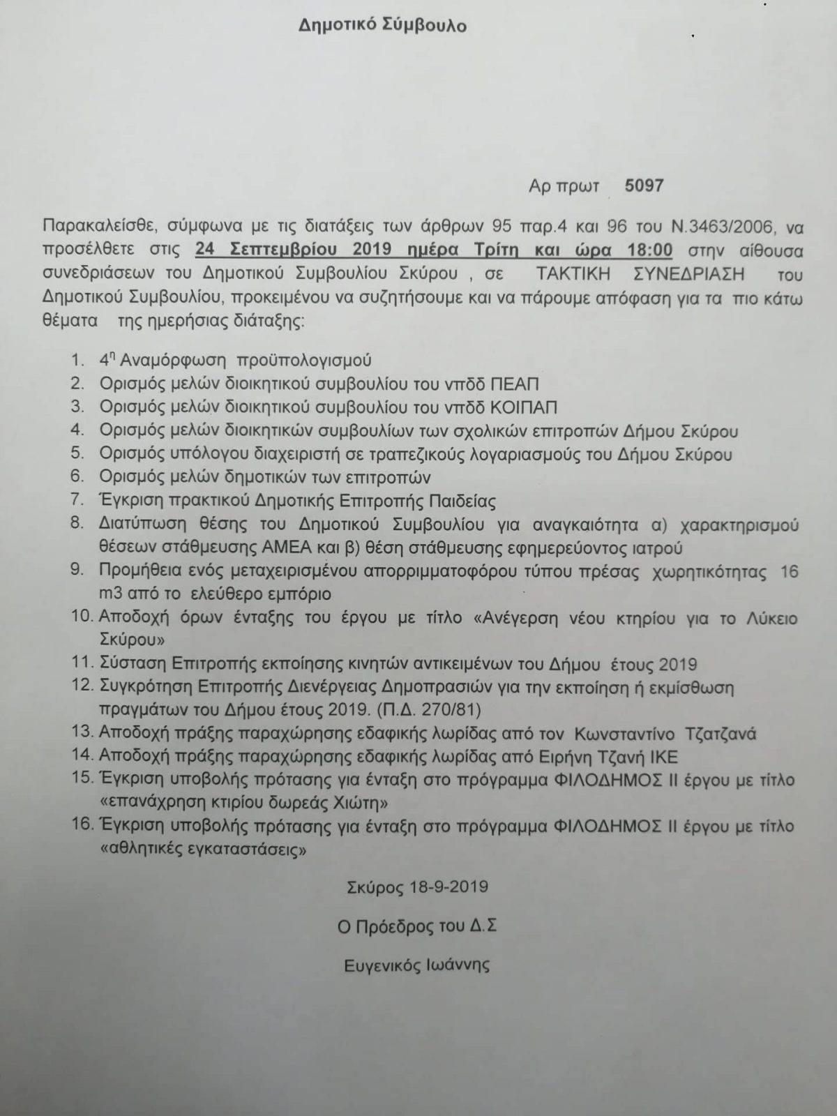 Χθες Τρίτη 24 Σεπτεμβρίου 2019 και ώρα 6:00μμ πραγματοποιήθηκε το πρώτο Δημοτικό Συμβούλιο του Δήμου Σκύρου.