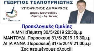 Αυτό είναι το πρόγραμμα των προεκλογικών ομιλιών του υποψήφιου δήμαρχου Μαντουδίου-Λίμνης-Αγίας Άννας Γιώργου Τσαπουρνιώτη