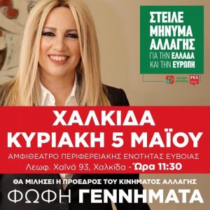 Στη Χαλκίδα θα βρίσκεται η πρόεδρος του Κινήματος Αλλαγής Φώφη Γεννηματά την Κυριακή 5 Μαίου. Η πρόεδρος του ΚΙΝΑΛ θα πραγματοποιήσει ομιλία στις 11.30 το πρωί στην αίθουσα του Αμφιθέατρου της Περιφερειακής Ενότητας.