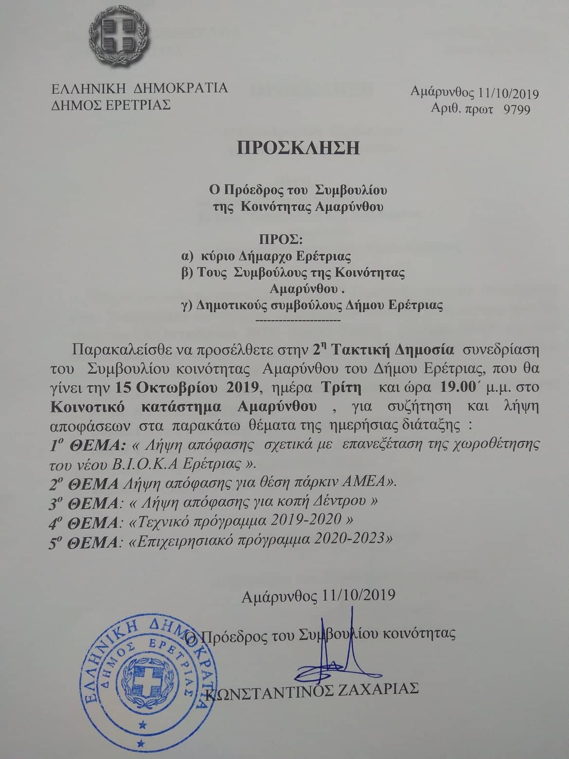 Συνεδριάζει την Τρίτη 15 Οκτωβρίου το συμβούλιο της Κοινότητας Αμαρύνθου στις 19.00 μ. μ.