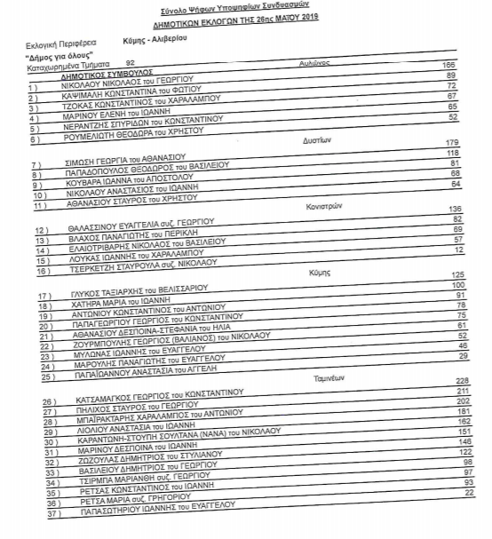 Τελικοί σταυροί του Δήμου Κύμης Αλιβερίου σύμφωνα με το Πρωτοδικείο. Α΄ΜΕΡΟΣ ΣΥΓΚΕΝΤΡΩΤΙΚΟΣ ΠΙΝΑΚΑΣ ΑΝΑ ΣΥΝΔΙΑΣΜΟ
