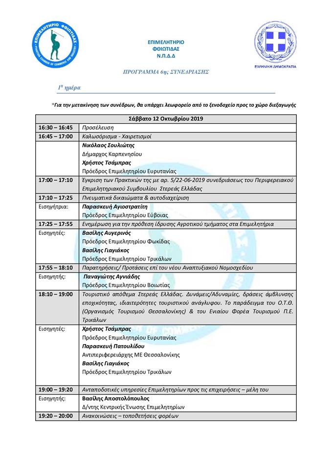 Στο Καρπενήσι θα πραγματοποιηθεί η η 6η Συνεδρίαση του Περιφερειακού Επιμελητηριακού Συμβουλίου (Π.Ε.Σ.) Στερεάς Ελλάδας στις 12 & 13 Οκτωβρίου 2019. Η συνεδρίαση θα γίνει στην αίθουσα συνεδριάσεων Δημοτικού Συμβουλίου – Ν. Τςιαμποφλα – κτίριο ΚΑΠΗ, 3ος όροφος) έχει ως εξής: