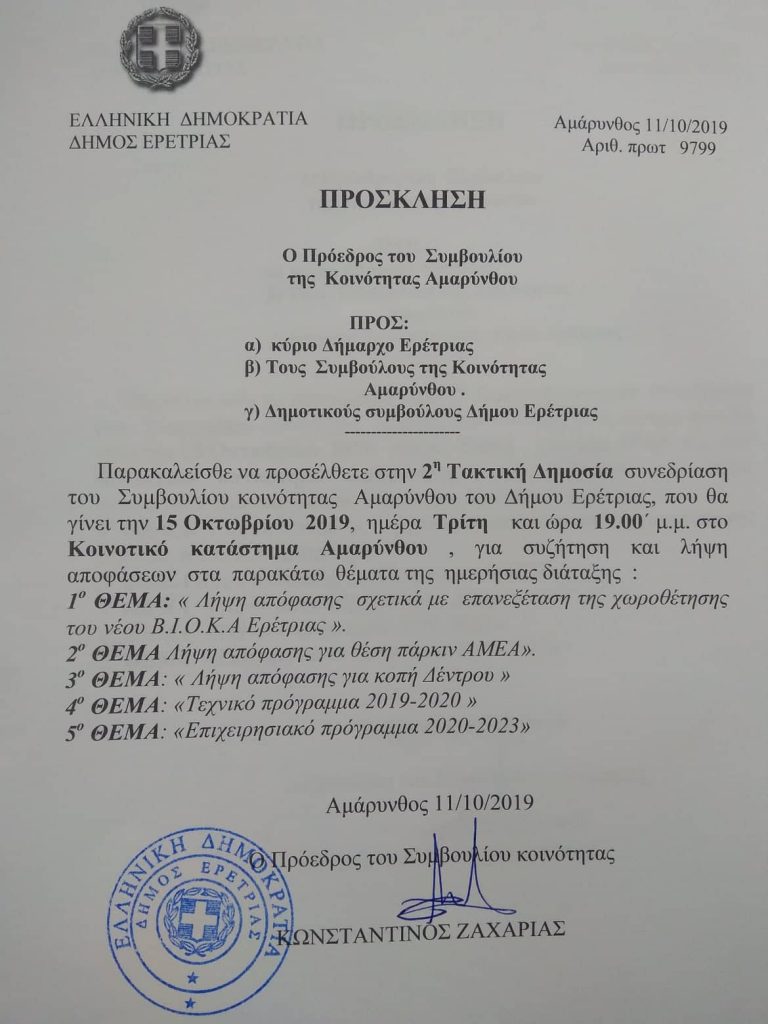 ΤΩΡΑ – Συνεδριάζει το συμβούλιο της Κοινότητας Αμαρύνθου