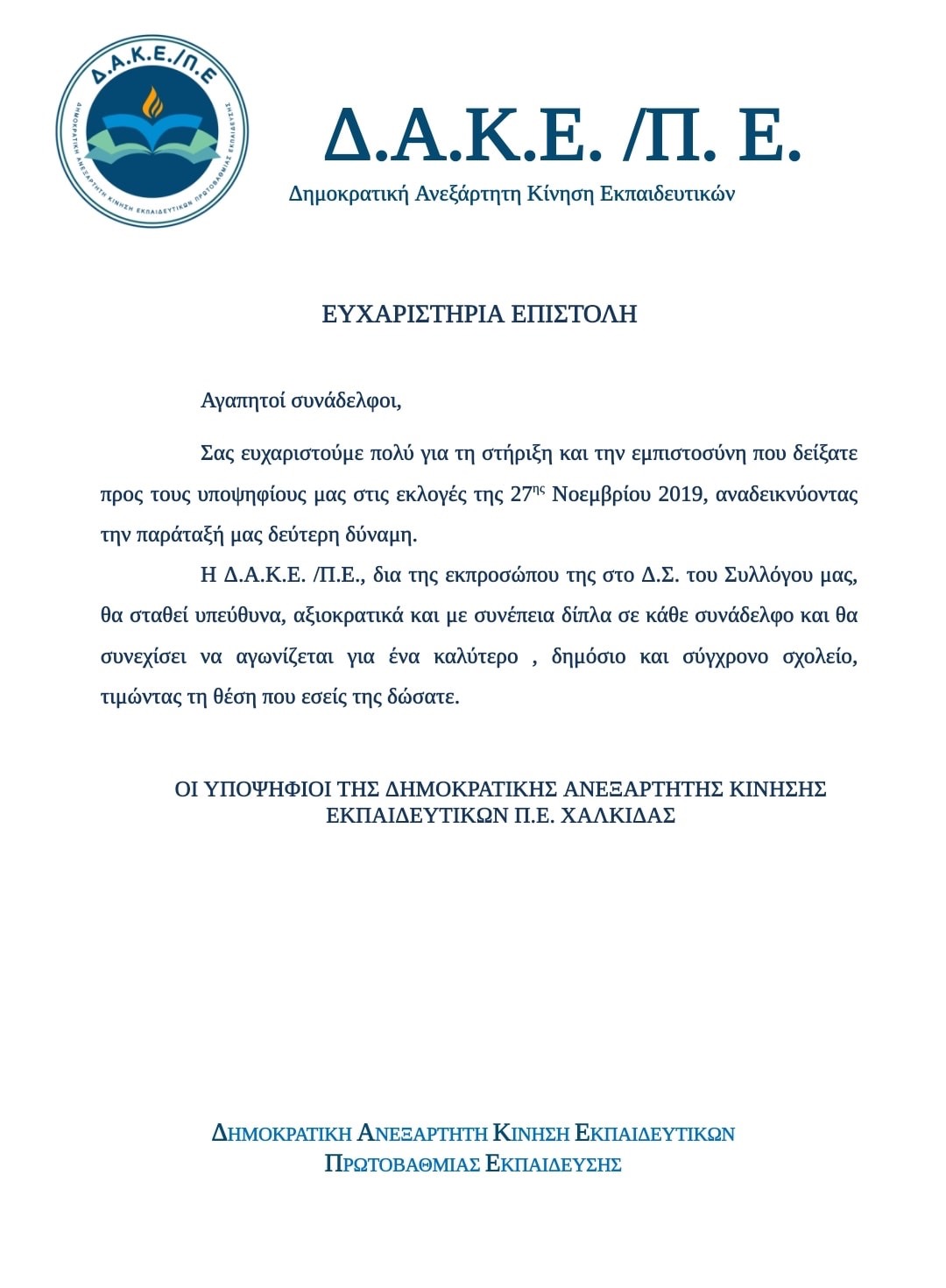 Ευχαριστούμε πολύ τους συναδέλφους που έδωσαν τη στήριξη τους στη Δ.Α.Κ.Ε/Π.Ε. και μας ανέδειξαν δεύτερη δύναμη στις σημερινές εκλογές για το Δ.Σ. του Συλλόγου μας!