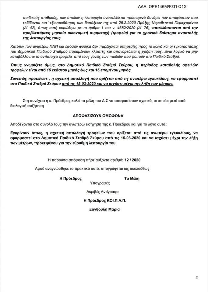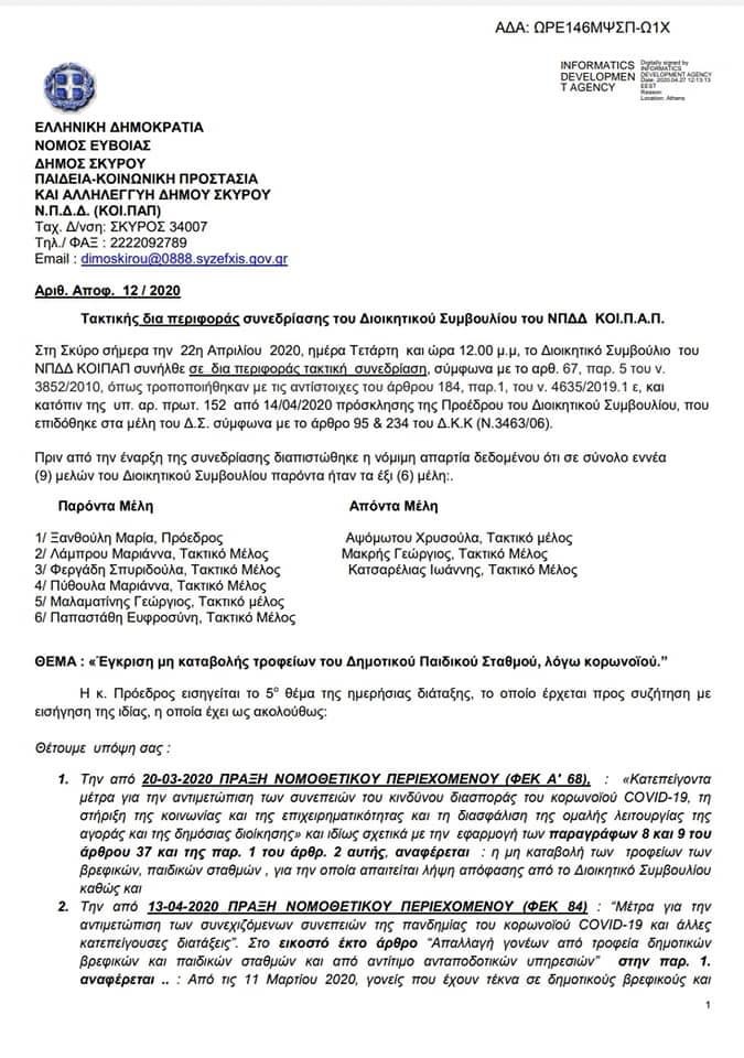 Έγκριση μη καταβολής τροφείων του Δημοτικού Παιδικού Σταθμού, από 15/3/2020 μέχρι και την λήξη των μέτρων λόγω κορωνοϊού αποφάσισε κατά την δια περιφοράς συνεδρίαση του στις 22 Απριλίου το ΝΠΔΔ του δήμου Σκύρου.