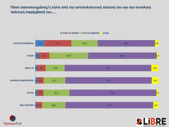 Είναι χαρακτηριστικός ο μικρός βαθμός ικανοποίησης από την αντιπολιτευτική τακτική τους με την ΠΛΕΥΣΗ ΕΛΕΥΘΕΡΙΑΣ να βρίσκεται στην πρώτη θέση όσων δηλώνουν πολύ και αρκετά ικανοποιημένοι με 29.3%, το ΠΑΣΟΚ με 11.5%, το ΜΕΡΑ 25 με 8.4%, τον ΣΥΡΙΖΑ και το ΚΙΝΗΜΑ ΔΗΜΟΚΡΑΤΙΑΣ με 6.7% και την ΝΕΑ ΑΡΙΣΤΕΡΑ με 5.5%.