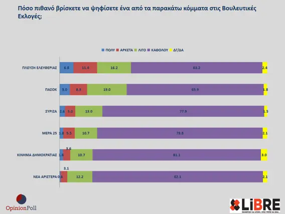 Αν αθροίσουμε τα πολύ και αρκετά , η ΠΛΕΥΣΗ ΕΛΕΥΘΕΡΙΑΣ συγκεντρώνει 18.2%, το ΠΑΣΟΚ 13.3%, ο ΣΥΡΙΖΑ 7.6%, το ΜΕΡΑ 25 7.3, το ΚΙΝΗΜΑ ΔΗΜΟΚΡΑΤΙΑΣ 5.2% και η ΝΕΑ ΑΡΙΣΤΕΡΑ 3.7%.