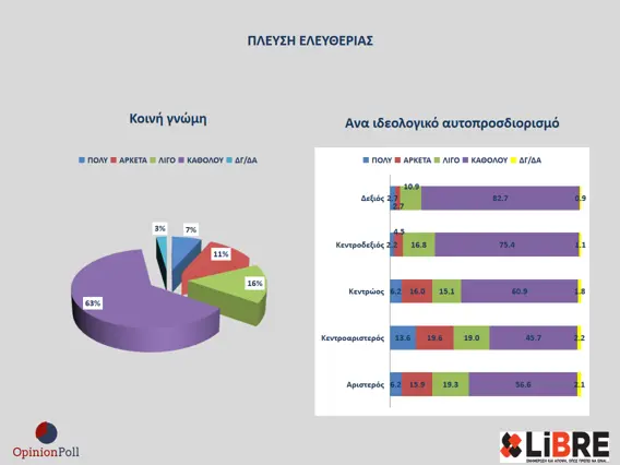 Αν δούμε δε τι δηλώνουν όσοι αυτοκαθορίζονται Κεντρώοι ή κεντροαριστεροί, πολύ και αρκετά δηλώνουν αντίστοιχα: ΠΛΕΥΣΗ ΕΛΕΥΘΕΡΙΑΣ 22.2% και 33.2%, ΠΑΣΟΚ 20.3% και 27.3%, ΣΥΡΙΖΑ 7.1% και 14.2%, ΜΕΡΑ 25 6.4% και 12%, ΚΙΝΗΜΑ ΔΗΜΟΚΡΑΤΙΑΣ 6.2% και 9.2%, ΝΕΑ ΑΡΙΣΤΕΡΑ 3.6% και 7.6%.