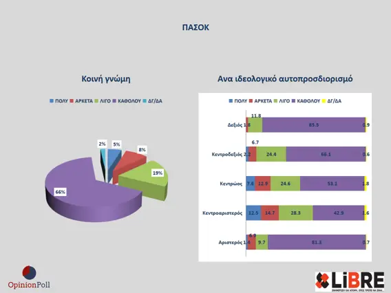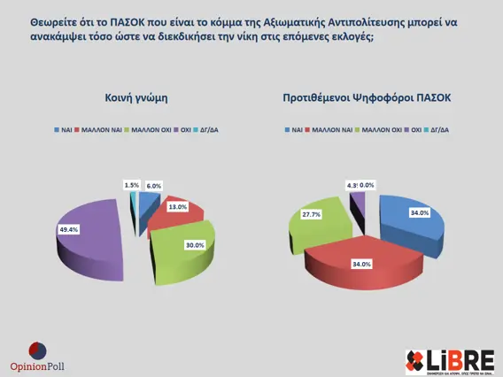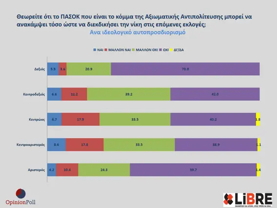 Είναι χαρακτηριστικό, όπως προκύπτει από την δημοσκόπηση της OPINION POLL που διεξήχθη για λογαριασμό του libre (η έρευνα περιλαμβάνει όλες τις τελευταίες εξελίξεις, όπως θα δείτε στη σχετική “Ταυτότητα”): Μόνο το 19% στην κοινή γνώμη πιστεύει ότι το ΠΑΣΟΚ μπορεί να ανέβει στο επόμενο διάστημα τόσο ώστε να μπορέσει να νικήσει στις εκλογές , με το 79.4% να έχει αντίθετη άποψη. Ανάμεσα στους κεντρώους το ποσοστό αυτό φτάνει το 24.6% και τους κεντροαριστερούς το 26.4%. Ωστόσο και στην γενικότερη ερώτηση αν κάποιο κόμμα της κεντροαριστεράς μπορεί να αντιμετωπίσει νικηφόρα την Ν.Δ ναι και μάλλον ναι δηλώνει το 23.2% , ενώ αντίθετη άποψη έχει το 73.8%.