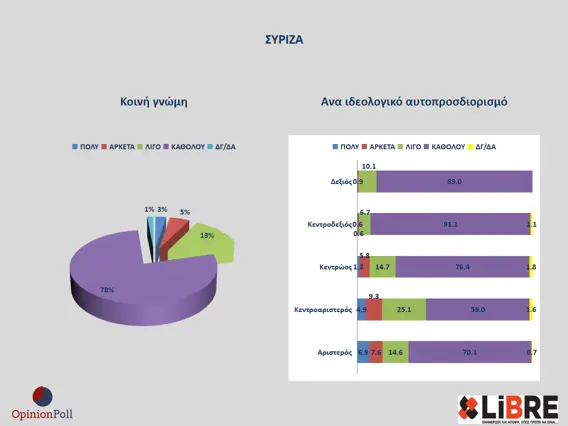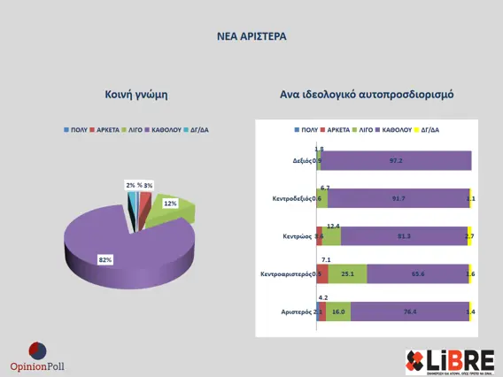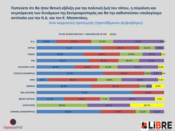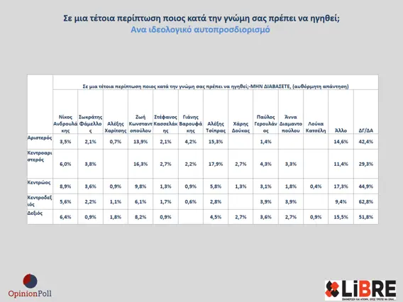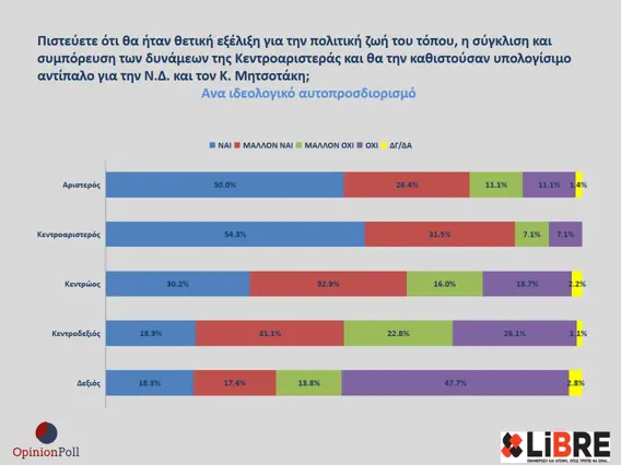 Ανάμεσα στους κεντρώους το ποσοστό αυτό φτάνει το 24.6% και τους κεντροαριστερούς το 26.4%. Ωστόσο και στην γενικότερη ερώτηση αν κάποιο κόμμα της κεντροαριστεράς μπορεί να αντιμετωπίσει νικηφόρα την Ν.Δ ναι και μάλλον ναι δηλώνει το 23.2% , ενώ αντίθετη άποψη έχει το 73.8%.