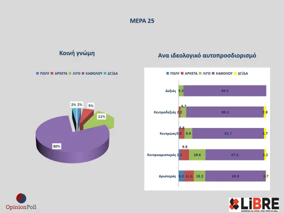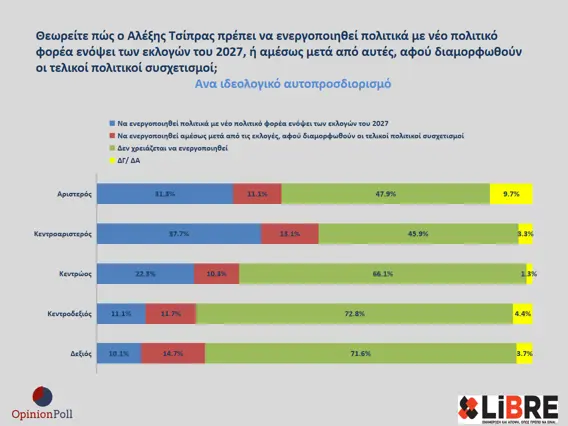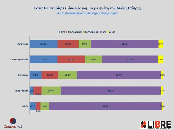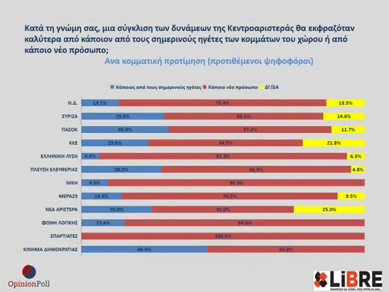 Απορριπτικό απέναντι και στα δύο αυτά ενδεχόμενα είναι το 25.5% . Ανάμεσα στους Κεντρώους το 44.8% τάσσεται υπέρ νέου φορέα και ανάμεσα στους κεντροαριστερούς το 42.2%.