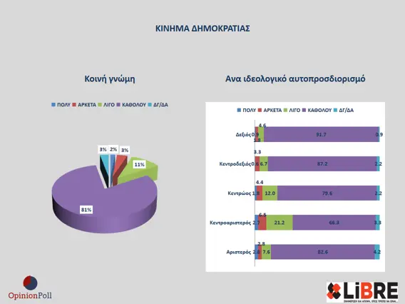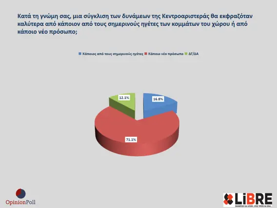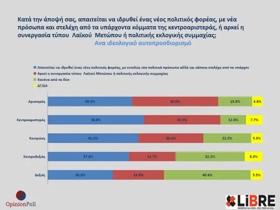 Παράλληλα, αναδεικνύεται η ανάγκη για την ίδρυση νέου πολιτικού φορέα. Χαρακτηριστικά: Ανάμεσα στους Κεντρώους το 44.8% τάσσεται υπέρ νέου φορέα και ανάμεσα στους κεντροαριστερούς το 42.2%.