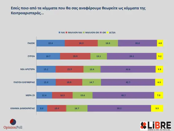 Το ΠΑΣΟΚ θεωρείται κεντροαριστερό από το 48.4% και ο ΣΥΡΙΖΑ από το 42.6%. Ακολουθούν ΝΕΑ ΑΡΙΣΤΕΡΑ με 37.1% , η ΠΛΕΥΣΗ ΕΛΕΥΘΕΡΙΑΣ το 36.2%, το ΜΕΡΑ 25 το 28.3% και το ΚΙΝΗΜΑ ΔΗΜΟΚΡΑΤΙΑΣ το 23.6%. Ανάμεσα σε όσους αυτοκαθορίζονται κεντροαριστεροί , ο ΣΥΡΙΖΑ θεωρείται κεντροαριστερό κόμμα από το 59.7%, το ΠΑΣΟΚ από το 57.8%, η ΝΕΑ ΑΡΙΣΤΕΡΑ από το 52.6%, η ΠΛΕΥΣΗ ΕΛΕΥΘΕΡΙΑΣ από το 49.2%, το ΚΙΝΗΜΑ ΔΗΜΟΚΡΑΤΙΑΣ από το 30.4% και το ΜΕΡΑ 25 από το 40.7%