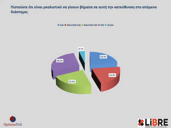 Πόσο ρεαλιστική είναι η συνεργασία: Ταυτόχρονα βέβαια το 45.5% το θεωρεί ρεαλιστικό να γίνουν βήματα στο επόμενο διάστημα σ΄αυτή την κατεύθυνση στο επόμενο διάστημα , ενώ το 50.8% έχει αντίθετη άποψη .
