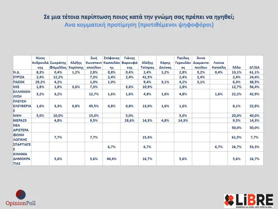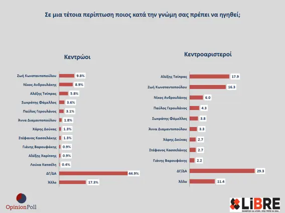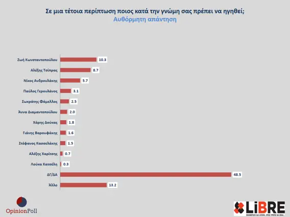 Σε αυθόρμητη απάντηση ποιος πρέπει να ηγηθεί σε μια τέτοια περίπτωση , προηγούνται οι Ζωή Κωνσταντοπούλου με 10.3% , Α. Τσίπρας με 8.7% και ο Ν. Ανδρουλάκης με 5.7% , ενώ ακολουθούν οι Π. Γερουλάνος με 3.1%, Σ. Φάμελλος με 2.5%, Α. Διαμαντοπούλου με 2%, Χ. Δούκας με 1.8% , ο Γ. Βαρουφάκης με 1.6%, Α. Χαρίτσης με 0.7% και η Λ. Κατσέλη με 0.3% , ενώ το ΔΓ/ΔΑ φτάνει το 48.5% και άλλον δηλώνει το 13.2%.