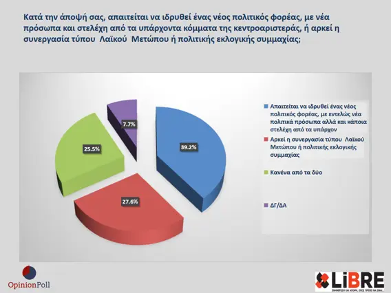 Στο σύνολο των ψηφοφόρων, το 39,2% δηλώνει ότι πρέπει να ιδρυθεί νέος πολιτικός φορέας, με εντελώς νέα πρόσωπα και προσθήκες από το υπάρχουν πολιτικό προσωπικό των κομμάτων της κεντροαριστεράς.
