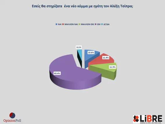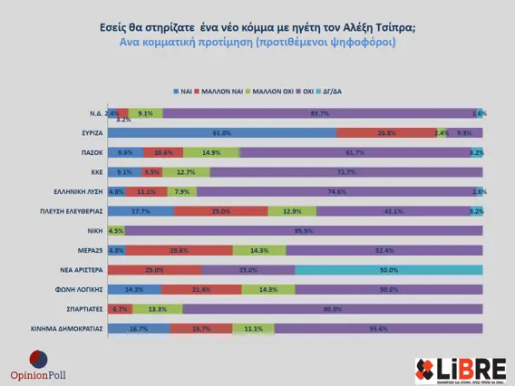 Το 22% (στο σύνολο) δηλώνει ότι θα στήριζε ένα νέο κόμμα με ηγέτη τον Α. Τσίπρα , με το 74.9% να κρατάει αρνητική στάση.